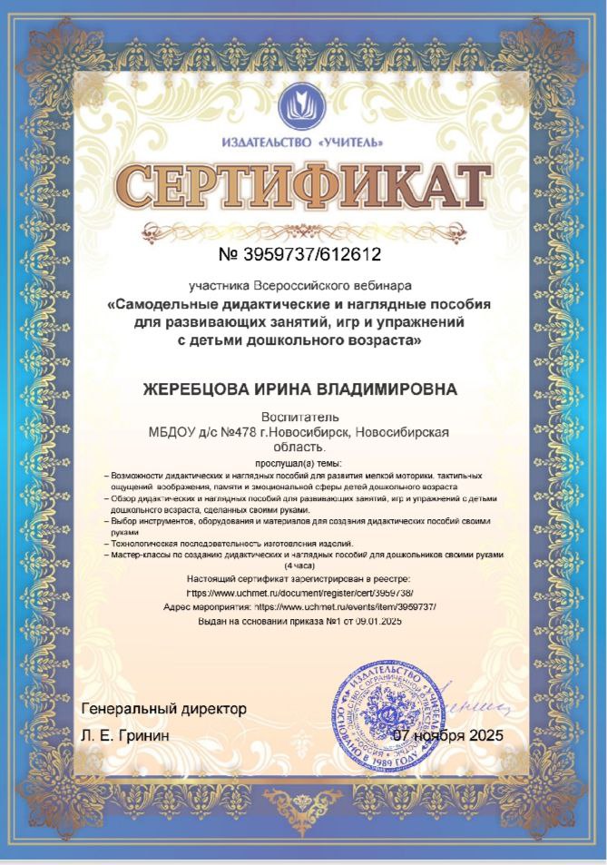 (выдан: Университет детства: "II Региональная школа Новосибирской области для педагогов дошкольного образования", 12/11/2020)